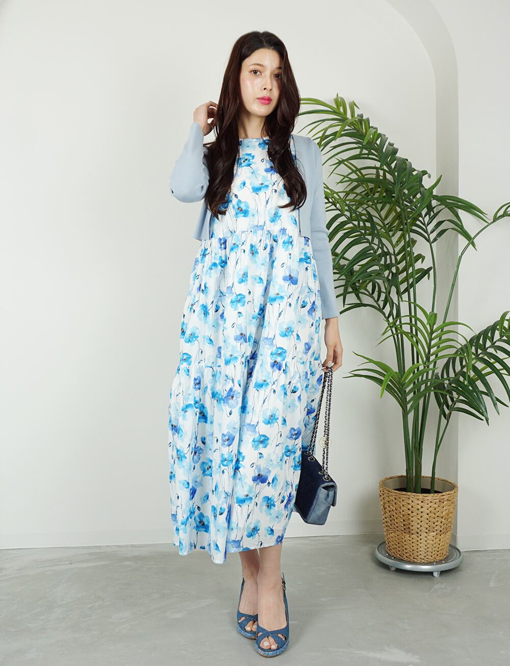 フラワーコットンティアードワンピース blue×white