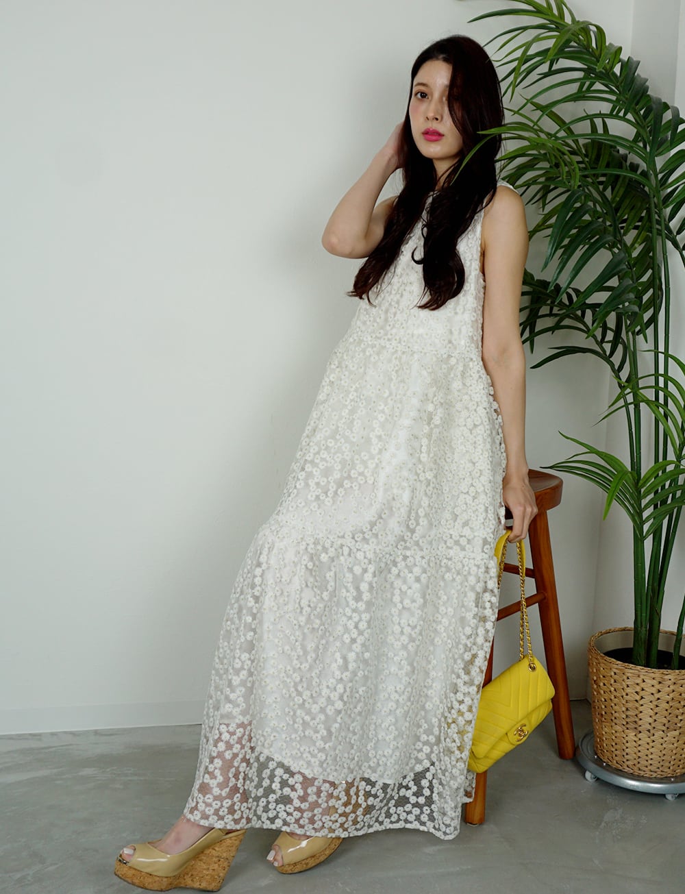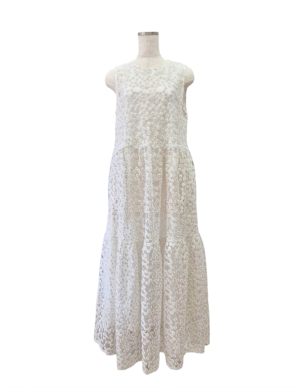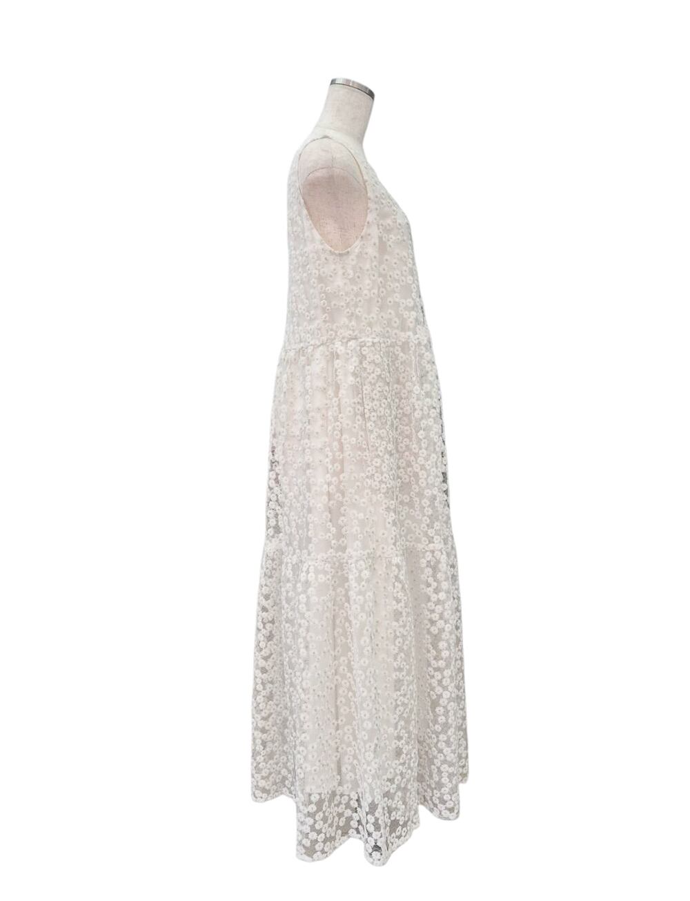 透け感が美しい繊細なオーガンジーに立体的なフラワー刺繍を贅沢に施した生地を使用し他ティアードワンピース。