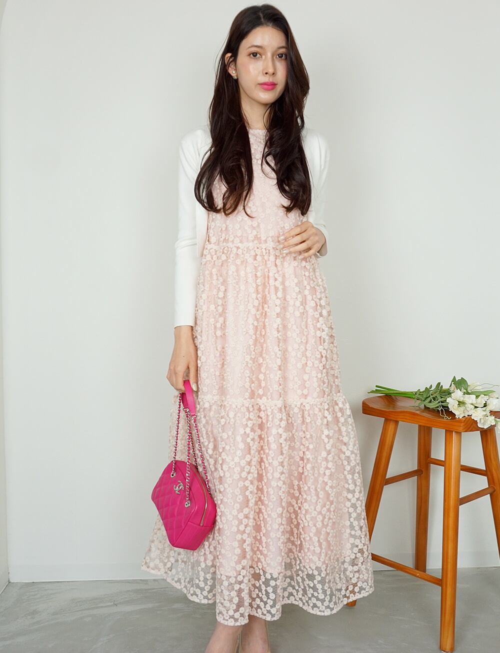 透け感が美しい繊細なオーガンジーに立体的なフラワー刺繍を贅沢に施した生地を使用し他ティアードワンピース。